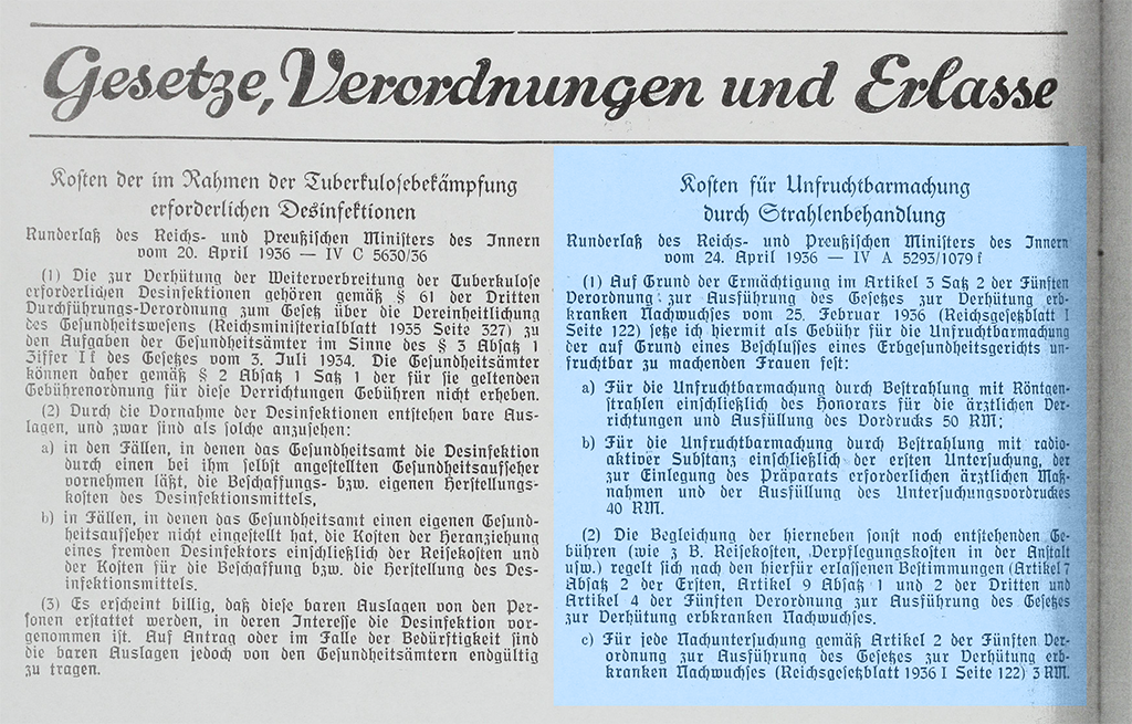 Kosten für Unfruchtbarmachung durch Strahlenbehandlung. Runderlass des Reichs- und Preussischen Minister des Innern vom 24. April 1936 – IV A 5293/1079 f (DAeBl. 1936, S. 616)