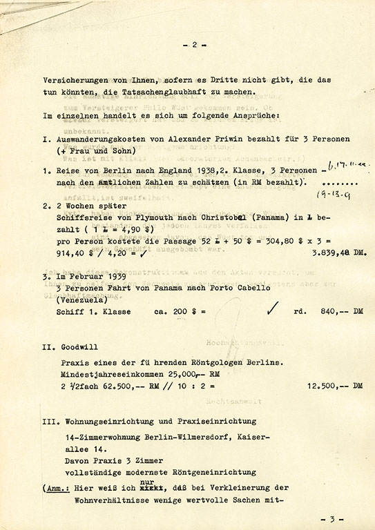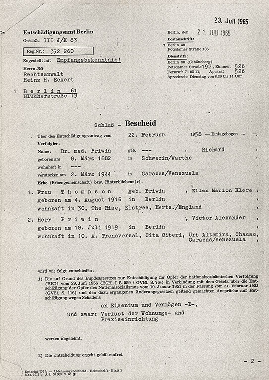 Dr. Richard Priwin, 1938 emigriert, musste seine Röntgeneinrichtung in Berlin zurücklassen. Die Schreiben, die sein Enkel, Dr. Richard Thompson, zur Verfügung stellte, dokumentieren den langen Weg zur materiellen Entschädigung.