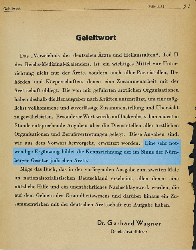 Foreword (in: Lautsch, H./Hans Dornedden (eds.): Directory of German Physicians and Medical Institutions. Reich Medical Calendar for Germany, Part II (Vol. 58), Leipzig 1937, p. III)