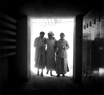 The end of the war meant many different things for many people. For the population of Berlin, which had suffered since 1943 under the bombing campaign against the city, the end of the war may have simply meant the cessation of military operations and bombardments. Even if the major hospitals had been moved to surrounding rural regions when the “threat from the air” began – for example, Eberswalde became the location of a capital city hospital – there was still medical infrastructure for those who remained in the city. The large bunker in Friedrichshain, shown in this photo by Hedda Walther, contained an entire hospital’s worth of medical equipment, where diagnostic examinations were done, X-rays taken, operations performed, patients nursed, and babies were born.