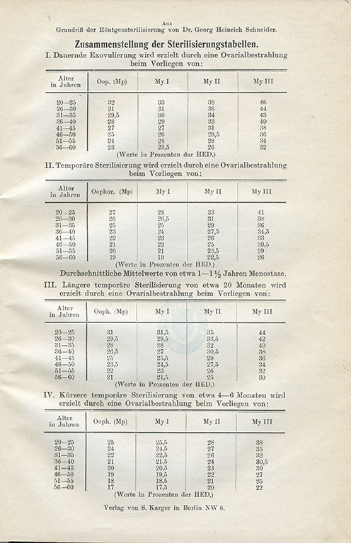 Die relativ hohe postoperative Gesamtmorbidität (Pneumonie, Peritonitis u.a.) bei Frauen – eine Studie über 1000 eugenische Sterilisierungen bewertete 9,5 % als nicht außergewöhnlich – machte die Suche nach einer anderen Methode der Unfruchtbarmachung notwendig. Die fünfte Verordnung zum „Gesetz zur Verhütung erbkranken Nachwuchses“ (GzVeN) erlaubte ab dem 1. Mai 1936 die Strahlenbehandlung zur Unfruchtbarmachung aus nicht medizinischer Indikation. Im Gegensatz zu der bisher geübten Praxis eines strahlenmedizinischen Eingriffs wurde bei der Unfruchtbarmachung der sogenannten Erbkranken nach dem GzVeN keine individuell-therapeutische Absicht verfolgt. Dies geht nicht nur aus den zahlreichen, parallel entstehenden medizinischen Forschungsarbeiten hervor, sondern auch aus der auf dem 30. „Deutschen Röntgenkongress“ in Stuttgart 1939 gezogenen Zwischenbilanz. In Referaten berichteten Carl Joseph Gauss und Arthur Pickhan über die Erfahrungen, die bis dato an 936 Frauen hatten gemacht werden können; beide stellten sowohl die Unfruchtbarmachung durch Röntgenstrahlen wie auch durch Radium-Einlage als „segensreiche Ergänzung“ der operativen Methode dar. Dass es sich nicht um eine Sterilisation, sondern um eine „Strahlenkastration“ mit allen unerwünschten gesundheitlichen Folgeerscheinungen handelte, vermerkte die Ankündigung der Beiträge zutreffend.