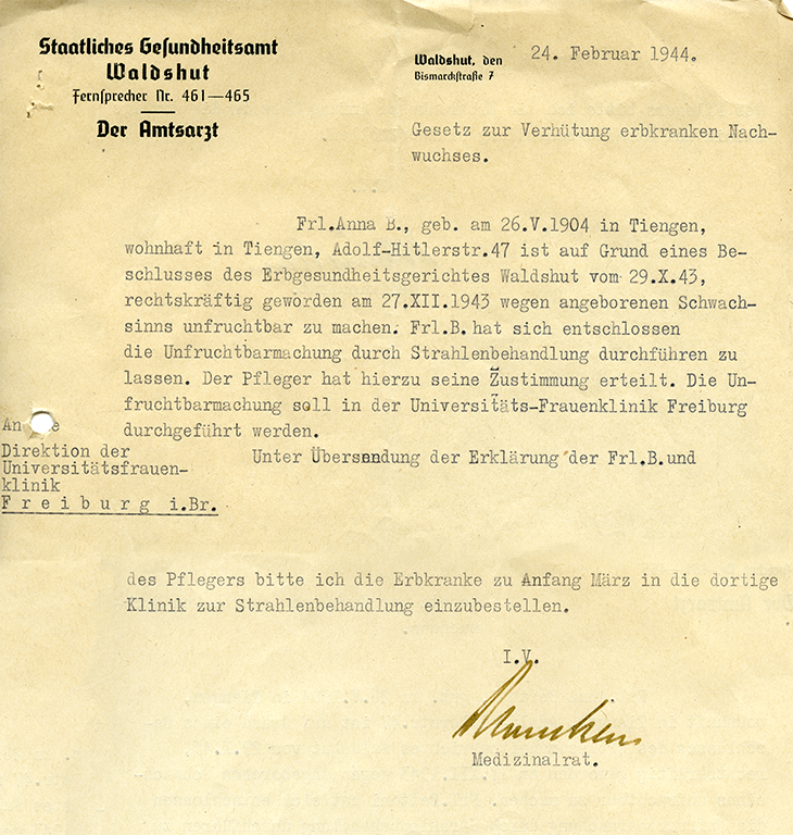 Staatliches Gesundheitsamt Waldshut. Der Amtsarzt, 24. Februar 1944. Strahlensterilisierung einer 40-jährigen Frau wegen angeborenen Schwachsinns